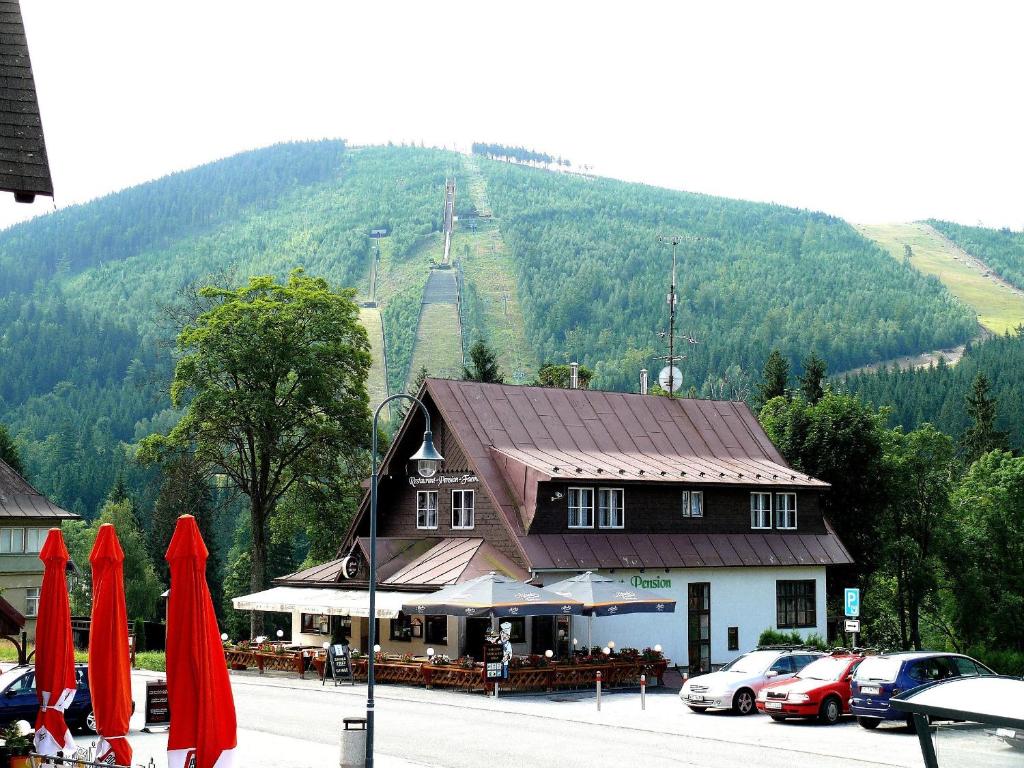 Tucked into the heart of Harrachov, a beloved mountain town in the western reaches of the Krkonoše range, Pension Faema is a welcoming three-star guesthouse that draws its character from the surrounding Giant Mountains landscape. Harrachov has long been a magnet for outdoor enthusiasts, known for its ski slopes, iconic ski jumping hills, and the historic Glass Museum that celebrates the region's centuries-old glassmaking tradition. The pension sits right in the town centre, placing guests within easy walking distance of all these attractions and the Čertova Hora Ski Lift. Every room at Pension Faema comes with a comfortable seating area, satellite television, and a private bathroom, while some offer balconies that open onto mountain views — a genuine highlight when the peaks are dusted with snow or cloaked in summer green. A continental breakfast is included in the stay, giving mornings a relaxed start before heading out to the slopes or trails. The property also features a terrace for unwinding after an active day, a bar for evening drinks, and bicycle rental for those visiting in warmer months. Free WiFi keeps connected travellers happy, and complimentary private parking removes any hassle for those arriving by car. An airport shuttle can also be arranged, which is a practical touch for international visitors. Couples have shown a particular fondness for the location, and it is easy to see why — the combination of mountain scenery, village charm, and effortless access to outdoor pursuits makes for an appealing retreat. Families will appreciate the on-site children's ski slope and ski school, while solo explorers and small groups can use Harrachov as a base for hiking the Krkonoše trails. Prague is roughly two and a half hours away by car, making this a rewarding weekend escape from the capital for anyone craving fresh mountain air.